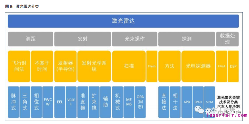 激光雷達(dá)的各個(gè)環(huán)節(jié)幾乎都有不同的執(zhí)行方式(如圖 9),單從測(cè)距這一個(gè)環(huán)節(jié)來(lái)看, 就存在基于時(shí)間的飛行時(shí)間法和不基于時(shí)間的相位式等方法,不同環(huán)節(jié)的組合構(gòu)成了激光 雷達(dá)的近二十種分類方法。