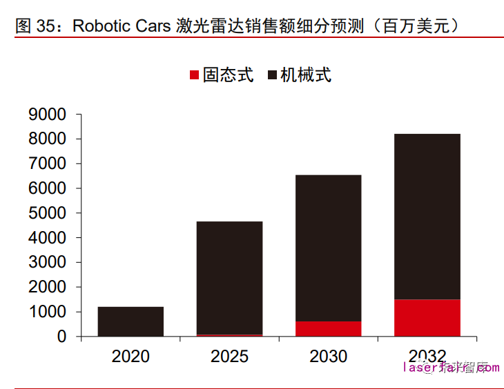 其中在 ADAS 領(lǐng)域,固態(tài)占主導(dǎo):Yole 預(yù)計(jì)固態(tài)激光雷達(dá)和 Flash 激光雷達(dá)出貨量 從 2021 年起逐漸增多,2025 年,固態(tài)/Flash 約為 50 萬(wàn)個(gè),機(jī)械式約 290 萬(wàn)個(gè),比例為 1:5.8;從 2029 年開(kāi)始,固態(tài)/Flash 出貨量超過(guò)機(jī)械式激光雷達(dá),到 2030 年,固態(tài)/Flash出貨量約為 1200 萬(wàn)個(gè),機(jī)械式約 730 萬(wàn)個(gè),比例為 1.64:1;從銷售額的角度,2025 年 固態(tài)/Flash 約為 2230 萬(wàn)美元,機(jī)械式達(dá)到 13.12 億美元;而到了 2030 年,固態(tài)/Flash 銷售額約為 45.83 億美元,機(jī)械式增加到 28.09 億美元。在 Robotic Cars 領(lǐng)域,機(jī)械式 占主導(dǎo),前期以機(jī)械式激光雷達(dá)為主,Yole 預(yù)計(jì)固態(tài)激光雷達(dá)和 Flash 激光雷達(dá)出貨量 在 2023 年起逐漸增多:2025 年,固態(tài)/Flash 約為 5 萬(wàn)個(gè),機(jī)械式約 120 萬(wàn)個(gè),比例為 1:24;到 2030 年,固態(tài)/Flash 出貨量約為 54 萬(wàn)個(gè),機(jī)械式約 400 萬(wàn)個(gè),比例為 1:7.4;從銷售額的角度,2025 年固態(tài)/Flash 約為 7300 萬(wàn)美元,機(jī)械式約 45.82 億美元;到 2030 年,固態(tài)/Flash 銷售額約為 6.46 億美元,機(jī)械式約 58.94 億美元。總的來(lái)看,根據(jù) Yole 預(yù)測(cè),固態(tài)激光雷達(dá)的銷售額占比將會(huì)從 2025 年的 4.78%增加到 2030 年的 37.25%,銷 量占比將會(huì)從 2025 年的 11.83%增加到 2030 年的 52.6%。