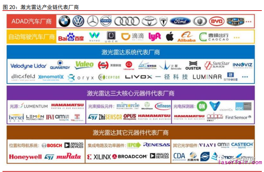 激光雷達(dá)產(chǎn)業(yè)鏈中,海外廠商在上游和中游都存在著領(lǐng)跑的優(yōu)勢(shì)(如圖 20),在技術(shù) 和客戶群等方面都領(lǐng)先于國(guó)內(nèi)廠商,但國(guó)內(nèi)廠商近年來(lái)奮起直追,取得了許多突破性的進(jìn) 展,中國(guó)勢(shì)力正在逐步崛起。