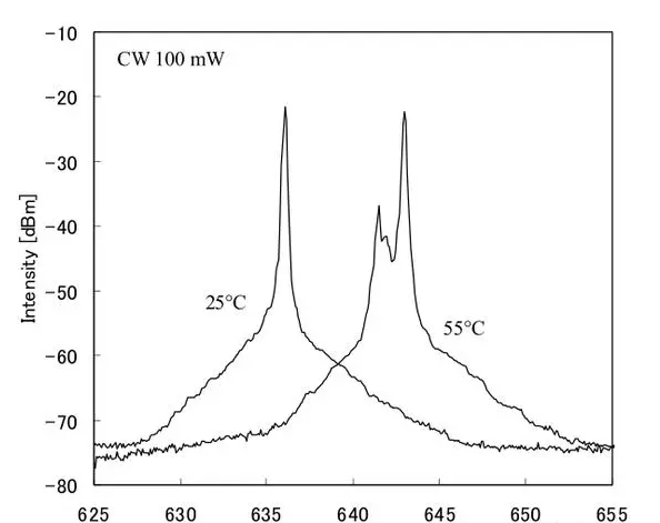 在可見紅光的波長范圍內(nèi),人們希望波長越短,亮度越高,因為隨著光源波長越短,人眼的靈敏度越高。一個660nm激光二極管是很好的開發(fā)和商業(yè)化的DVD光盤拾取應(yīng)用。然而,對于顯示應(yīng)用來說,更短的波長(~ 640 nm)是必要的,因為640 nm的眼睛靈敏度幾乎是660 nm的三倍。640nm LD的輸出功率要求至少大于50mw。但這取決于投影儀的實現(xiàn)方法。